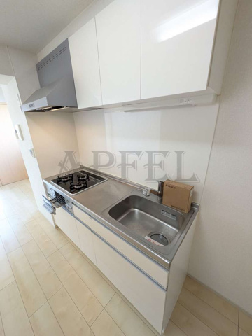 白を基調としたシステムキッチンで、室内全体の雰囲気と統一感があり、清潔感と明るさを感じられるキッチンスペースです。直線的で無駄のないデザインのため、生活感が出にくく、インテリアにも自然になじみます。