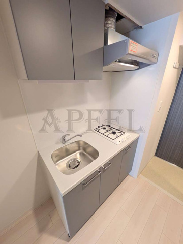 シンクは単身用としては十分な広さがあり、作業スペースもしっかり確保されています。上下に収納があるため、調理器具や食器類を整理しやすく、生活感を抑えたキッチン空間を維持できます。