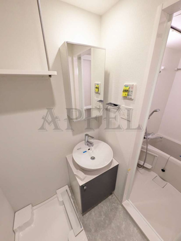 独立洗面台が設けられており、分譲仕様らしい使い勝手の良さが感じられる水回りです。丸型ボウルはデザイン性が高く、空間にやわらかい印象を与えています。鏡も縦型で見やすく、朝の身支度がしやすい仕様です。